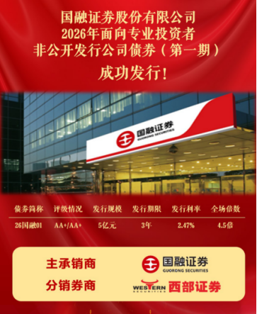 2026 年1月19日,国融证券 “26 国融 01”(代码:281340.SH)圆满完成发行,成功募集 5 亿元资金,票面利率2.47%,获4.5倍超额认购,彰显市场高度认可。该债券将于,2026年1月22日在上交所挂牌,标志着公司时隔 8 年后重返上交所债券市场,债务融资业务迎来新开局。